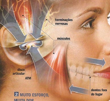 As dores de cabeça provenientes das disfunções de ATM, em geral, não são propriamente de cabeça: são dores nos músculos que envolvem a cabeça. Posições posturais viciosas, relacionamento dental inadequado, apertamento e/ou ranger de dentes, associados ao "stress", normalmente evoluem para quadros crônicos de dores nos músculos da face, da cabeça e do pescoço.